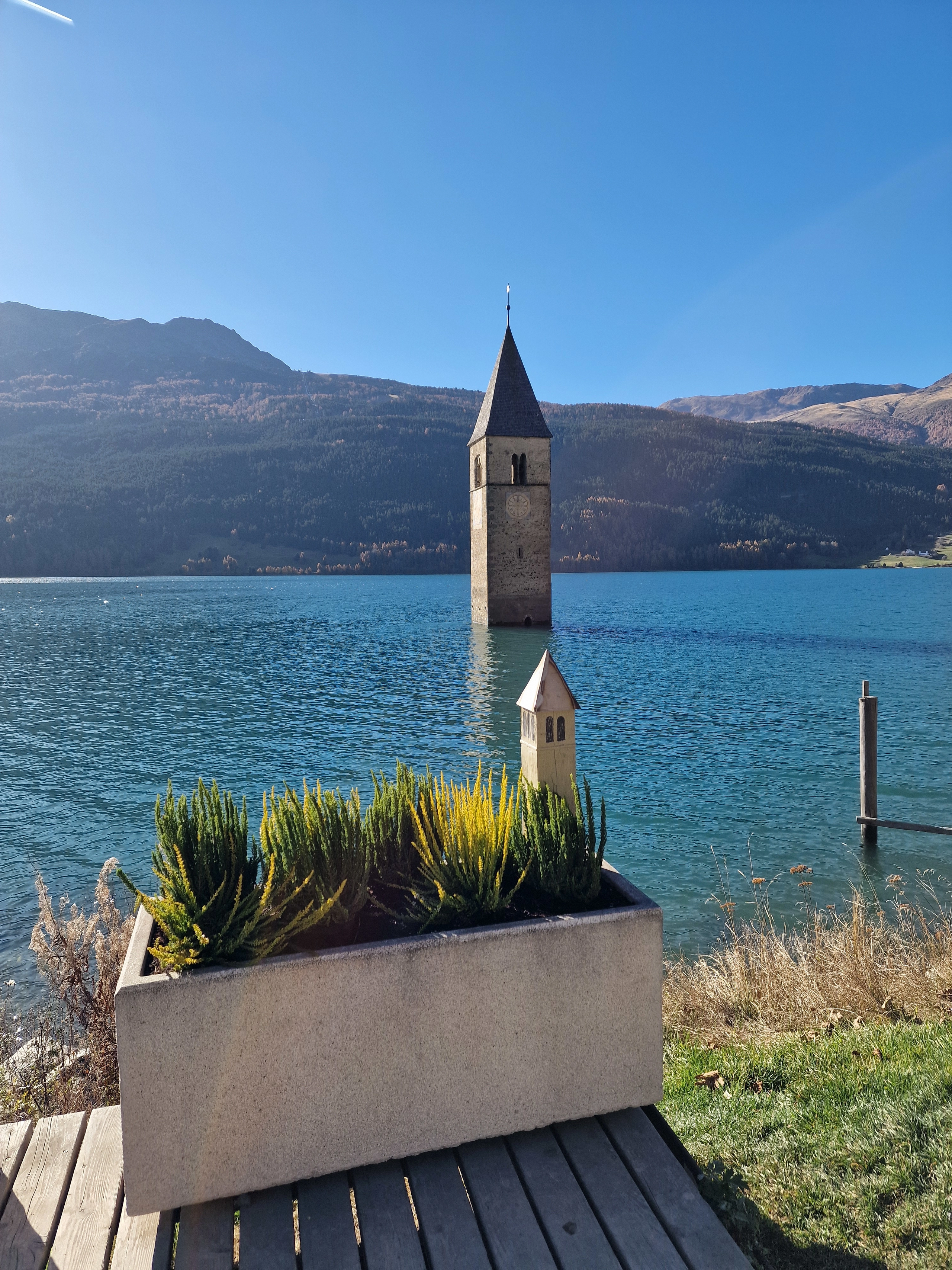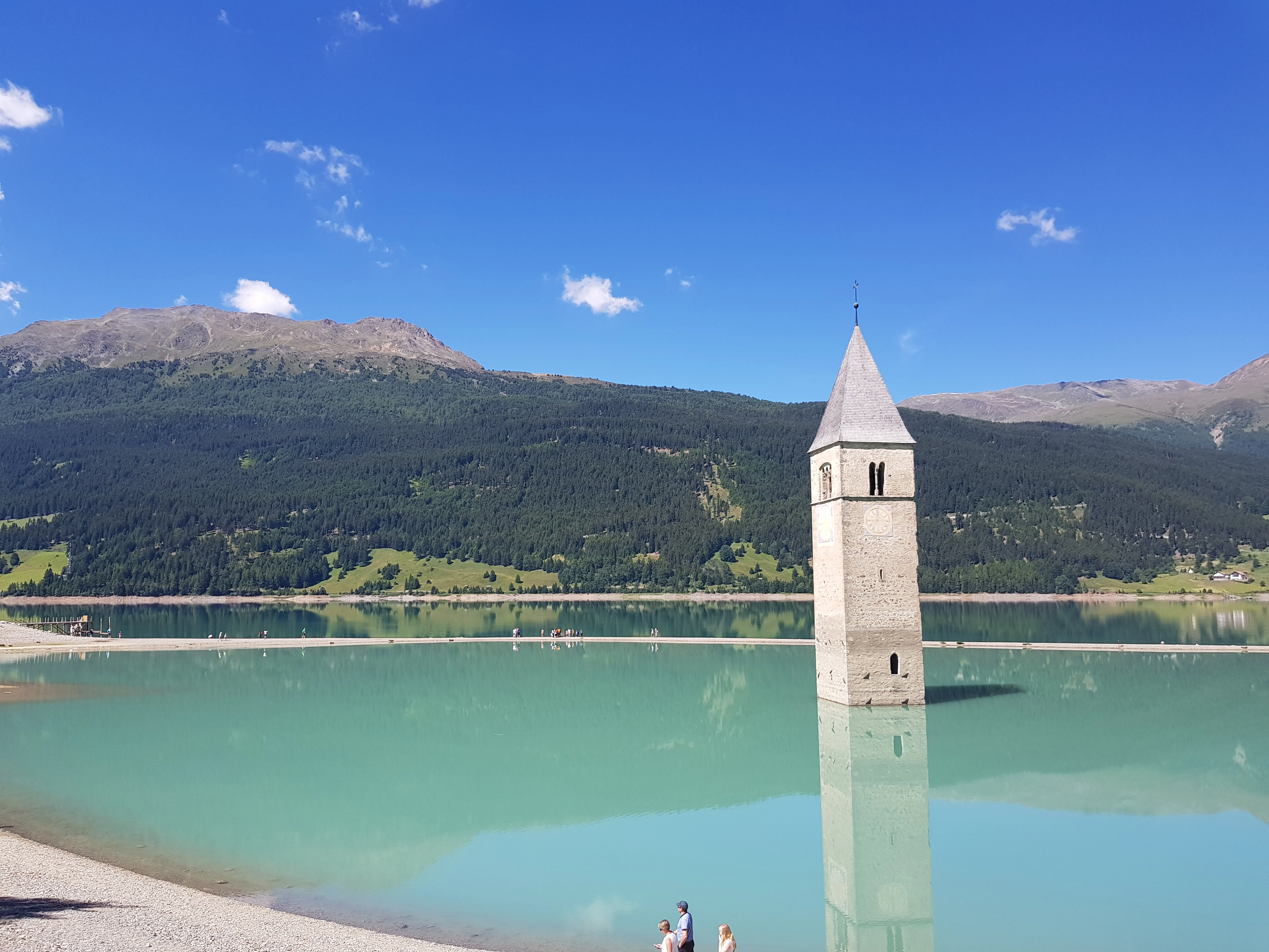 Gacher Blick auf der Piller Höhe, die Kirche im Reschensee, Blick