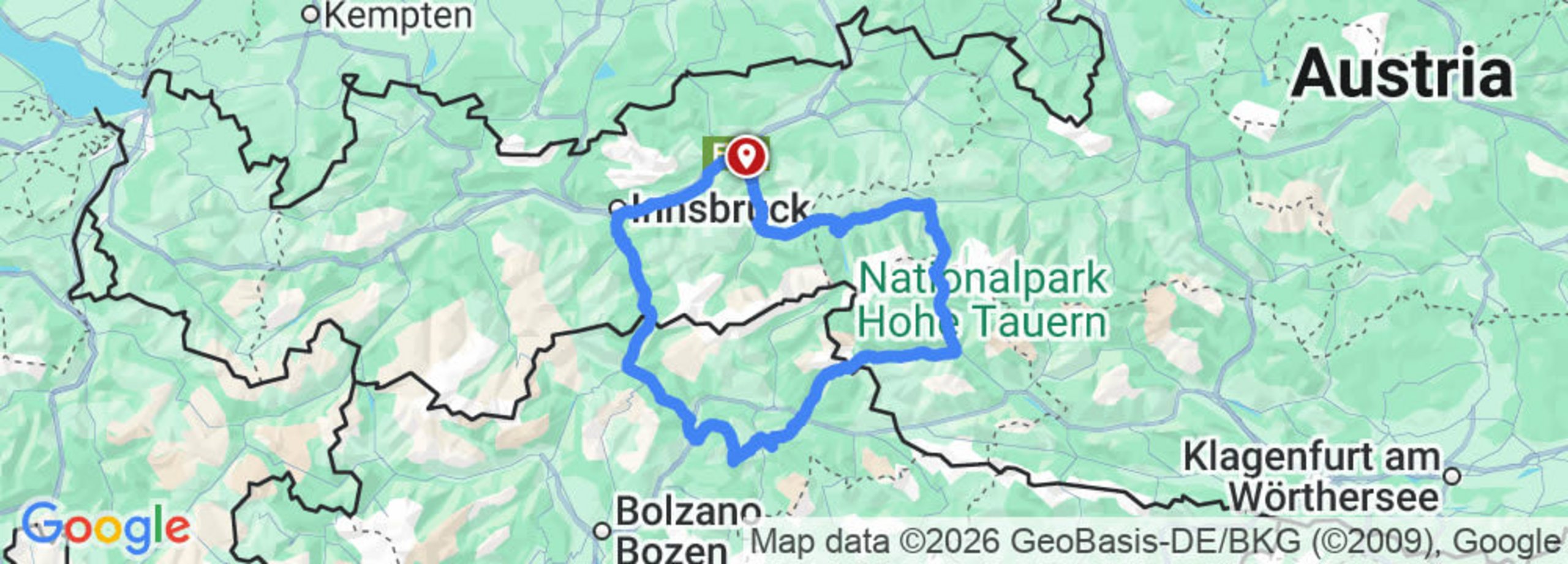 Hotel Sonnleiten, Bruck am Ziller → Gerlospass (1.531 m, Maut) → Mittersill → Felbertauerntunnel (1.632 m, Maut) → Matrei in Osttirol → Staller Sattel (2.059 m) → Furkelpass (1.789 m) → Würzjoch (1.987 m) → Brixen → Sterzing → Brennerpass (1.370 m) → Steinach am Brenner → Matrei → Patsch → Sistrans → Tulfes → Wattens → Schwaz → Hotel Sonnleiten, Bruck am Ziller
