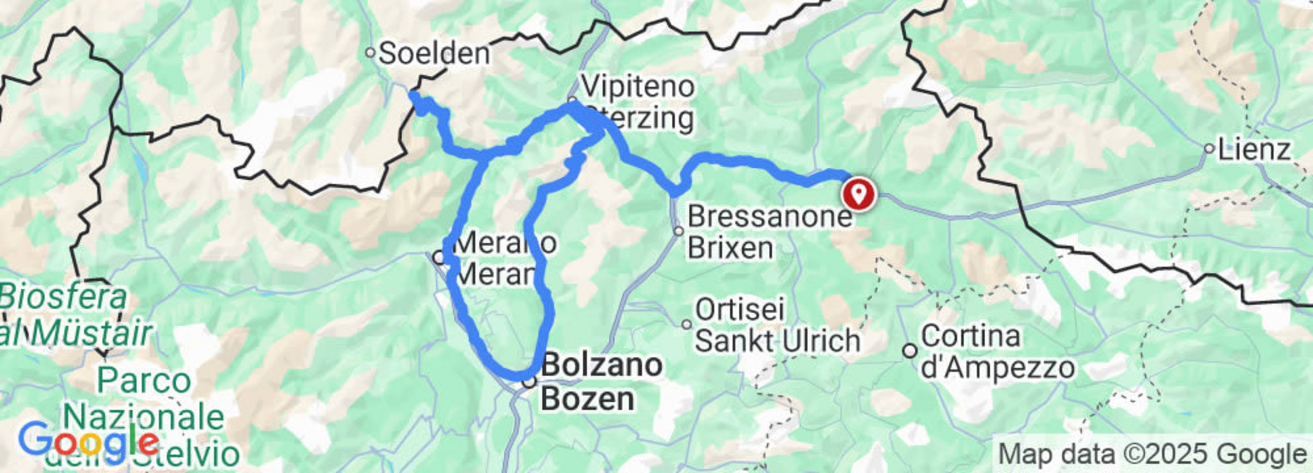 Moar's Hotel/Olang - Schabs - Sterzing - Jaufenpass (2.094 m) - St. Leonhard in Passeier - Timmelsjoch (2.474 m) - Passeiertal - Meran - Bozen - Sarntal - Penser Joch (2.211 m) - Sterzing - Schabs - Moar's Hotel